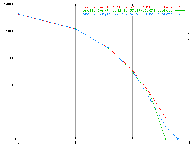 Hash crc32, bucket sizes 131073 131072 131071